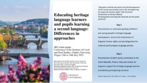 Tematyka języka polskiego jako odziedziczonego była także przedmiotem badań pilotażowych w projekcie Kształcenie uczniów uczących się języka dziedzictwa i uczniów uczących się drugiego języka: Różnice w podejściach, którego liderem był Uniwersytet Karola w Pradze. Polską stronę reprezentowała dr Beata Katarzyna Jędryka. Grant realizowany był w ramach mini projektów badawczych ze środków programu 4EU+. W lipcu odbyła się konferencja międzynarodowa, w której uczestniczyli badacze z Uniwersytetu Karola, Uniwersytetu Paryskiego (Sorbona), Uniwersytetu w Mediolanie, Uniwersytetu w Genewie oraz Uniwersytetu Warszawskiego. Podczas konferencji dyskutowano na temat języka odziedziczonego, jego funkcji oraz dydaktyce. Eksperci zagłębili się w znaczenie praw człowieka w kontekście językowym oraz wielojęzyczności, podkreślając, jak te zasady są integralną częścią kształtowania krajowych i europejskich polityk językowych.